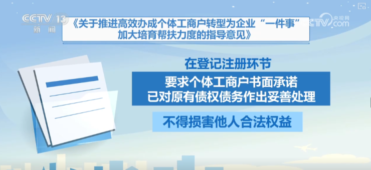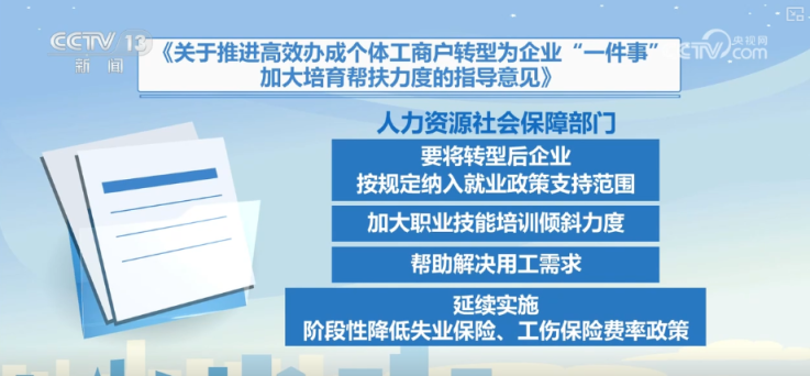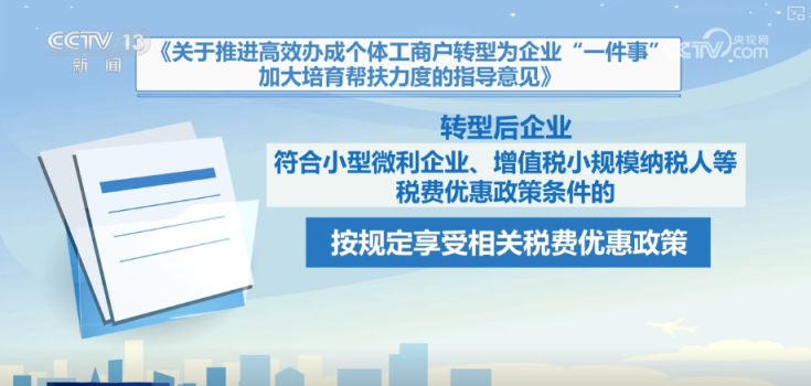 《指导意见》明确,降低“个转企”转换成本,实现接续办理涉企事项,加强涉税信息共享,延续有关行政许可,强化部门协同。