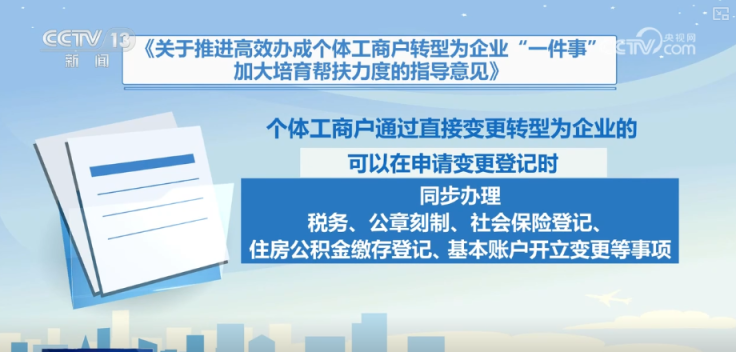 《指导意见》明确,个体工商户通过直接变更转型为企业的,可以在申请变更登记时,同步办理税务、公章刻制、社会保险登记、住房公积金缴存登记、基本账户开立变更等事项。鼓励提供预检服务,加强信息共享、便利企业办事。
